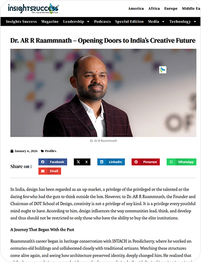 Insight Success featured Dr. AR R Raammnath for his leadership and vision in creative education. The article reflects his commitment to making design education accessible, relevant, and aligned with societal needs.