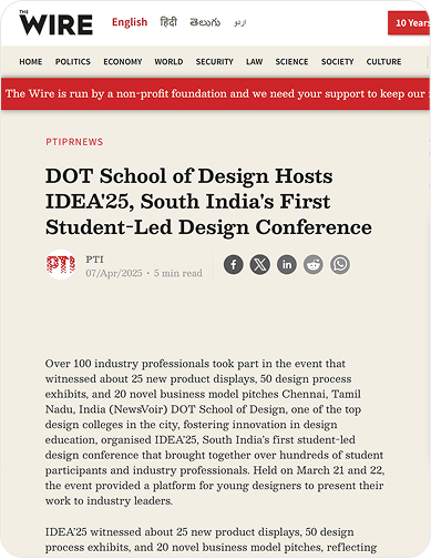 The newspaper feature on IDEA’25 acknowledged the initiative as a notable student-led design summit. It highlighted the creativity, leadership, and collaborative spirit of Dot School of Design students in driving industry-relevant discourse.